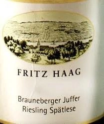 В престижных местах винодельни Fritz Haag Рислинг лозы исключительно, которые поддерживаются опытными сотрудниками год. Урожай делается вручную, конечно же, и часто в несколько проходов. Эта нежная обработка винограда и тщательной разработки вин находятся в руках Оливера Haag. Недвижимости предлагает все разнообразие Рислинг: сушат над деликатно фруктовым благородных сладких лучших вин, которые помогли Мозель Рислинг только его репутации.